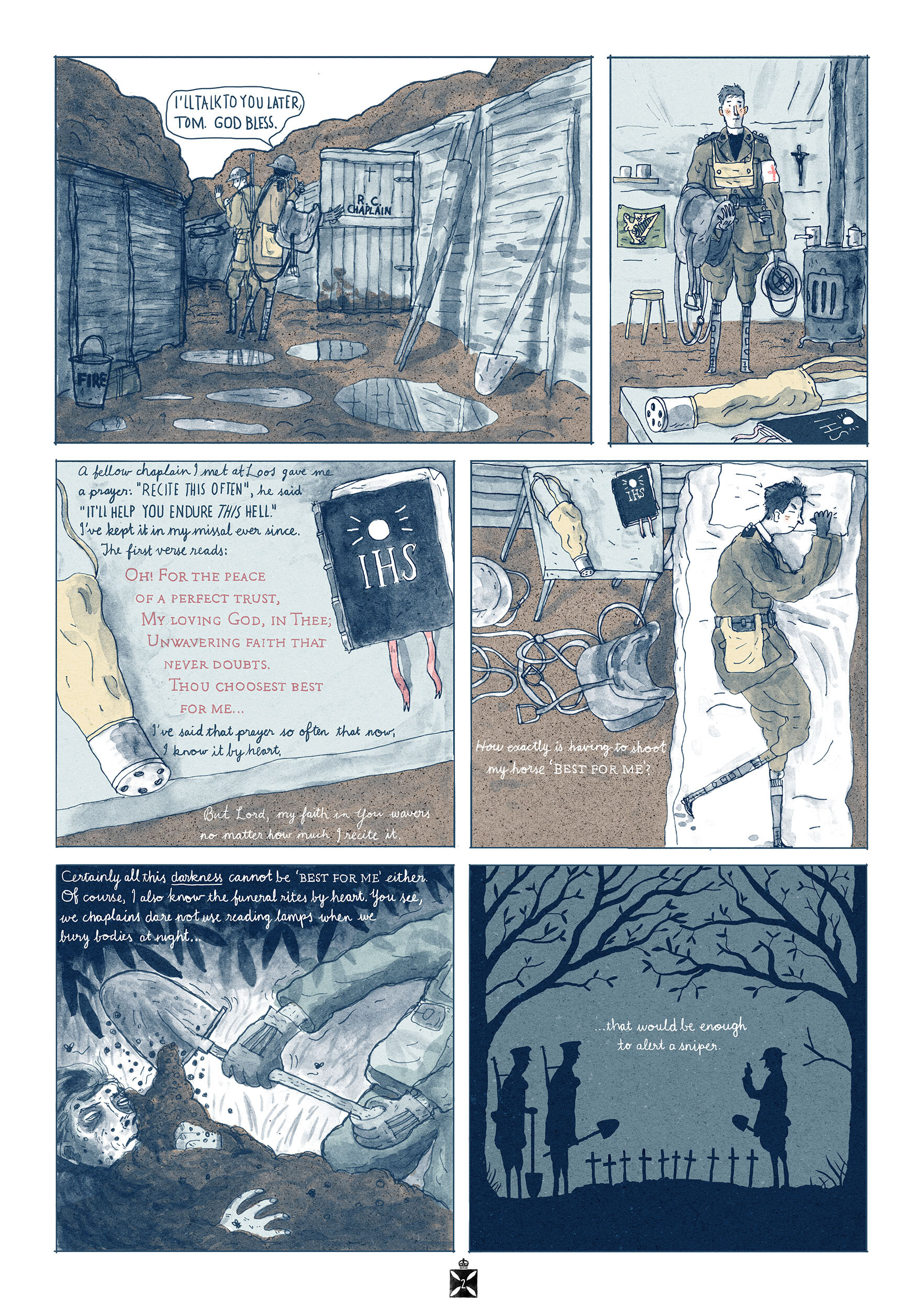 A Perfect Trust is a graphic short that I wrote and illustrated about a chaplain in the trenches of World War I. Based on much historical research, it won the Illustration for Publishing category at the Irish Design Award 2017. It was exhibited as part of a touring exhibit about military chaplains by the Irish Jesuit Archive, South Dublin County Council and the Office of Public Works (OPW). It features in the Stray Lines Irish Comics Collective anthology No.2