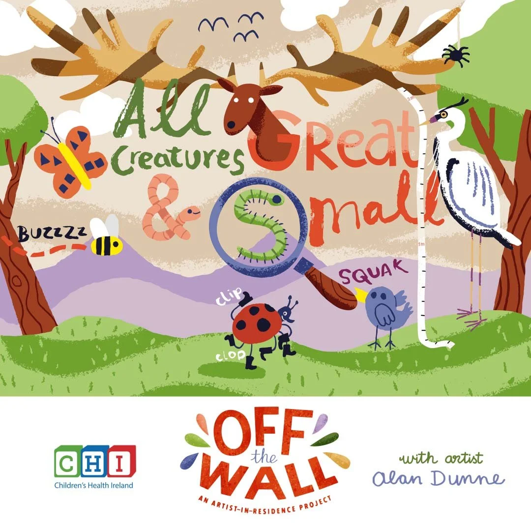 I was invited by Children’s Health Ireland (CHI) to participate in an artist in residence at CHI Connolly, Blanchardstown, Dublin. The Off-the-Wall mural artwork series was themed on Irish nature and wildlife, and inspired by artwork created by children, their families and staff at CHI Connolly. The work was created with The residency, which took place during the Covid-19 pandemic and was produced remotely.